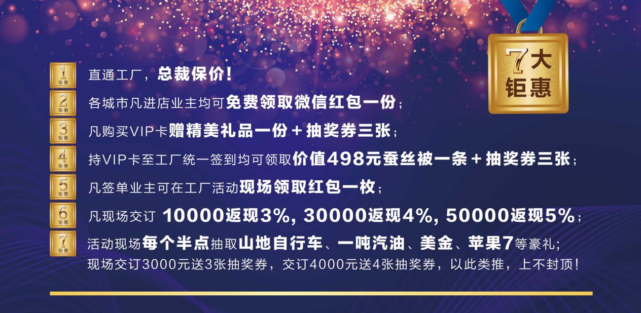 參加活動的消費者,即日起可以優(yōu)惠價購買VIP卡一張,VIP卡一經(jīng)簽到即可立刻領(lǐng)取價值498元高檔蠶絲被一條外加抽獎券三張,獲得抽取高額美金和蘋果7大獎的機會!